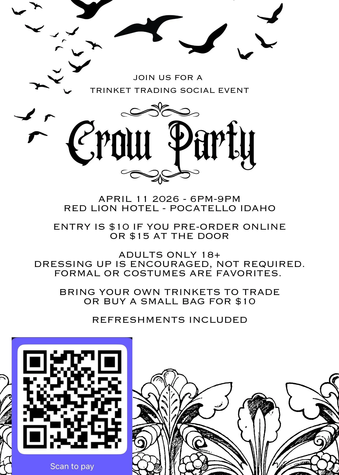 Join us in the Red Lion Hotel Ballroom in Pocatello Idaho on April 11 from 6-9pm. Adults Only (18+) Party includes music, snacks, nonalcoholic beverages and trinket trading. Bring your own shiny little things, found objects, and whatnots to trade with other crow minded folks. Or buy a bag of mystery trinkets that will be waiting for you at the event. Dress formal, funky, costumed or cozy. The bar will be closed since it’s a Sunday. If you arrive intoxicated, please travel with a sober driver, we love to party safely!