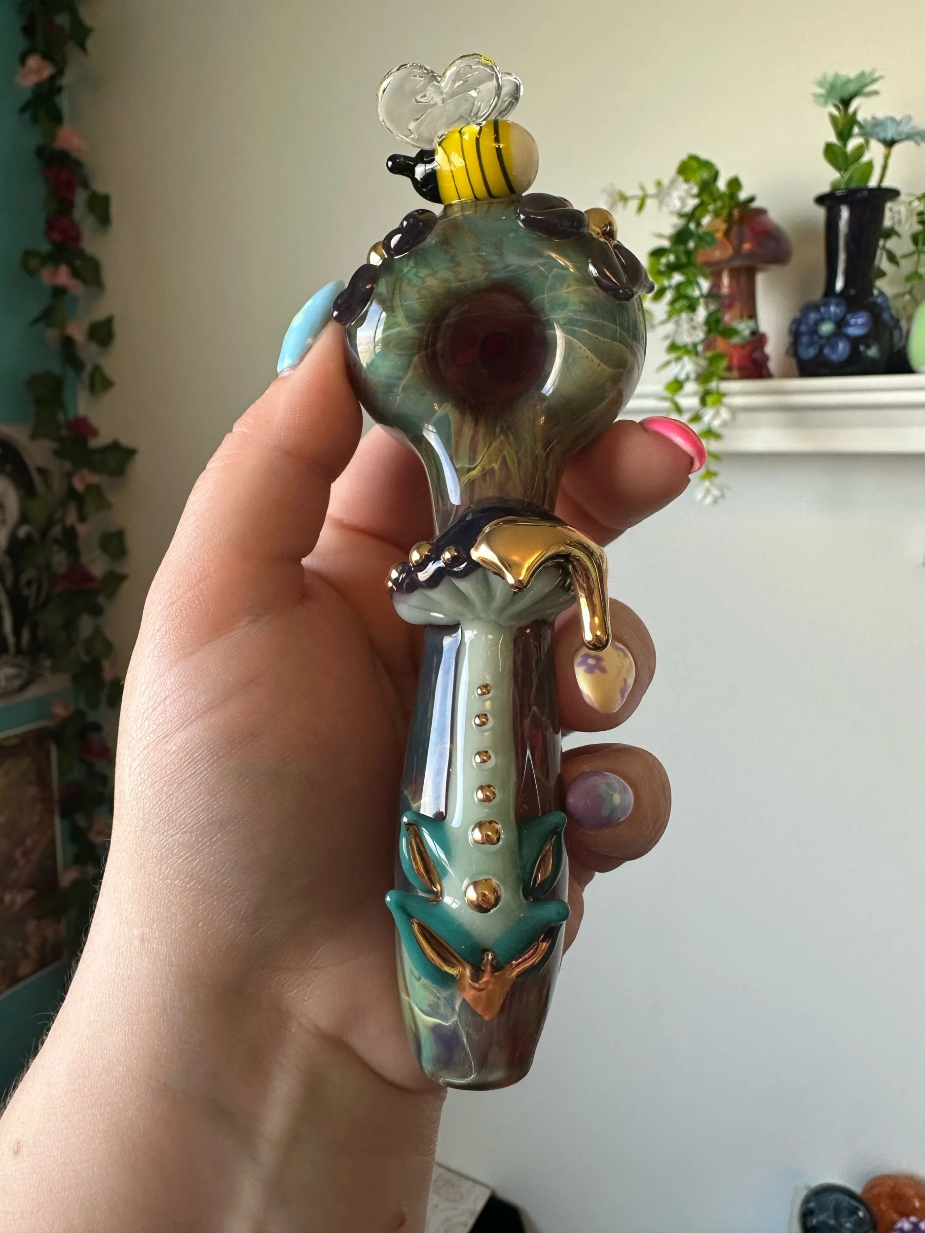 Gold lustre is fired onto the glass leaving a plate of real 22k gold. It is durable enough to wipe clean but can be scratched off with enough force. Soaking in alcohol or other solvents can damage the finish. May wear off with regular use. Do not microwave. Same application and risks apply to Mother Of Pearl Luster. Visit my Helpful Info page for cleaning tips.
