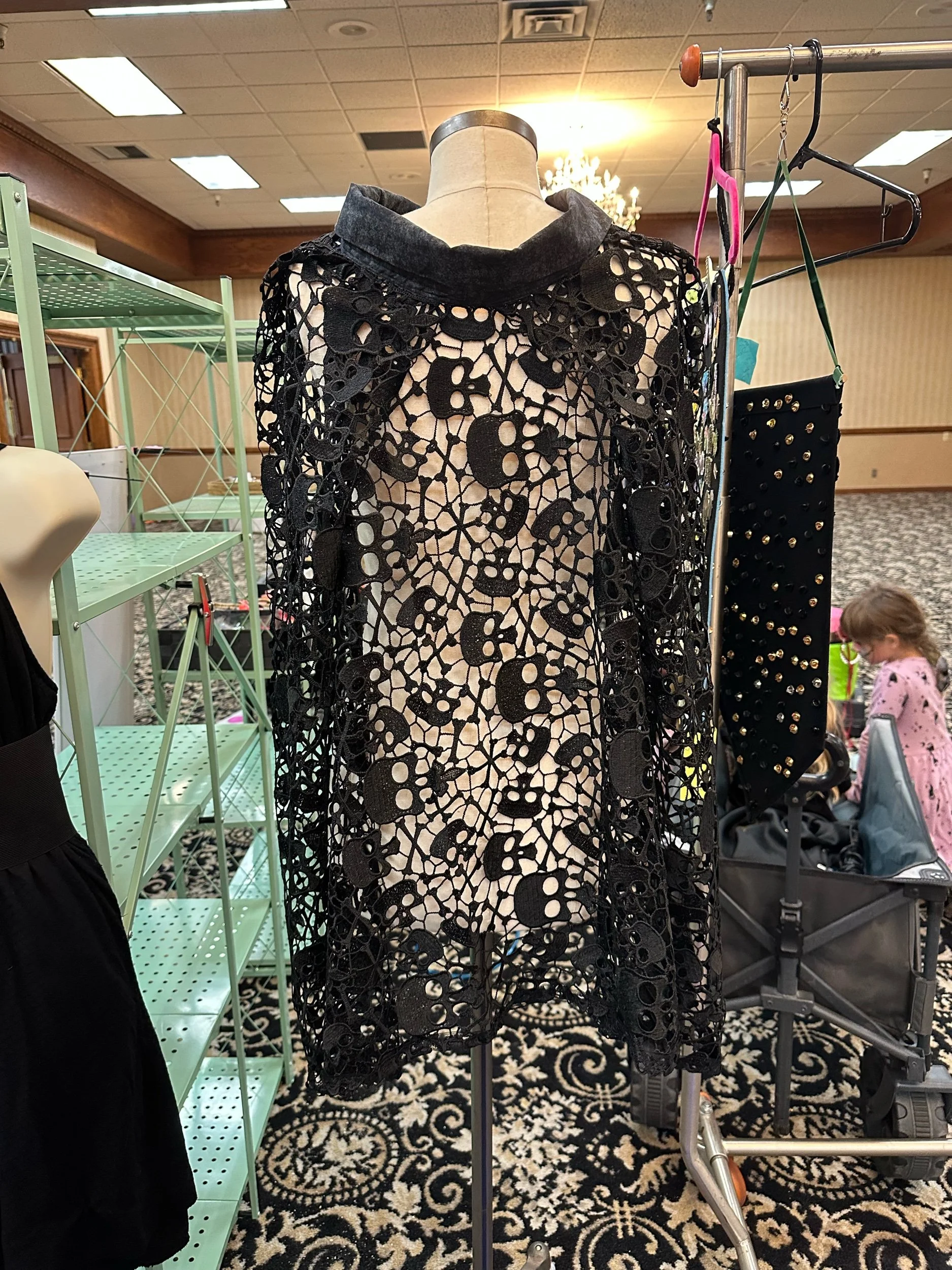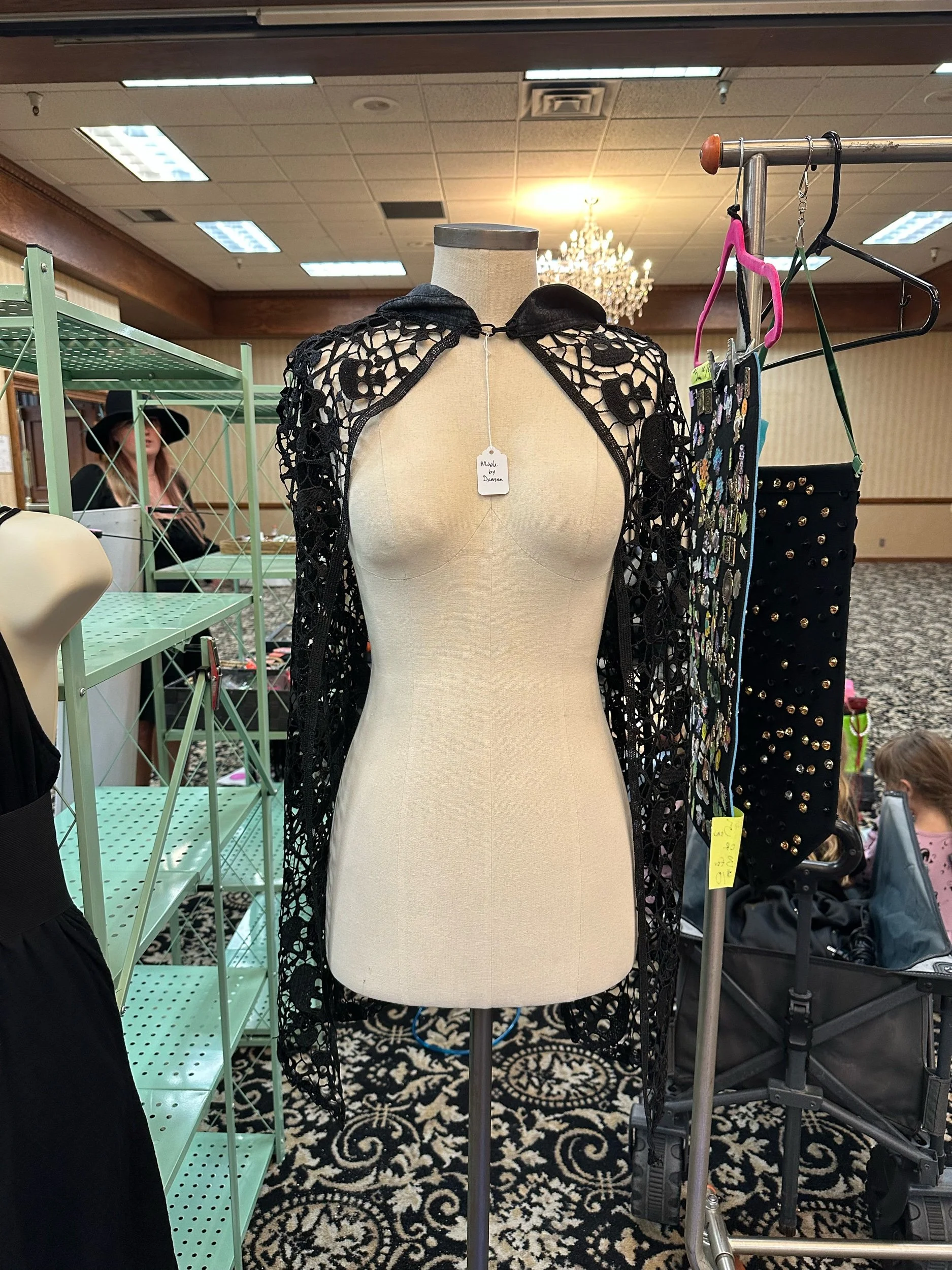 Sewn by Deanna! One size fits most, but smaller shoulders will fit better. I suggest a petite person (narrow shoulders) up to size 2XL. Wash on cold then hang to dry.