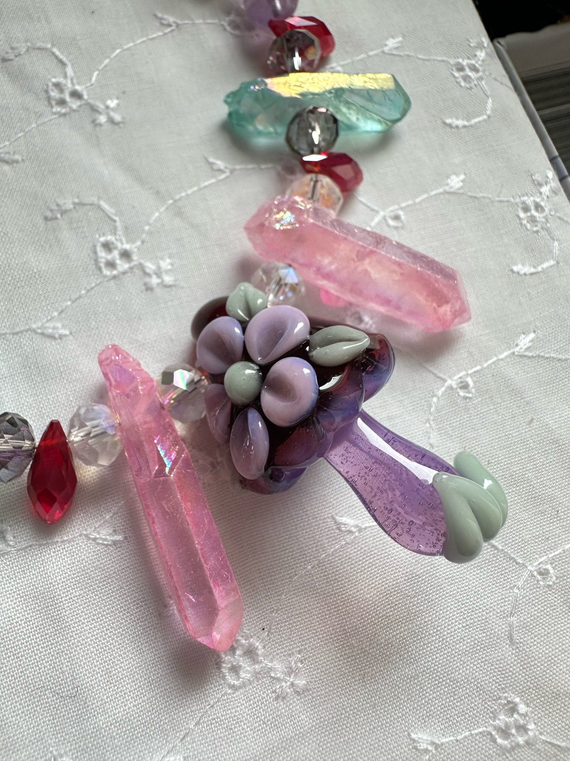 Beaded necklace made by Deanna Cook using one of her original sculpted glass pendants. This one is 18 inches around, strung on coated stainless steel wire with a plated stainless steel through-fastener. Beads: faceted acrylic, dyed quartz and Amethyst.