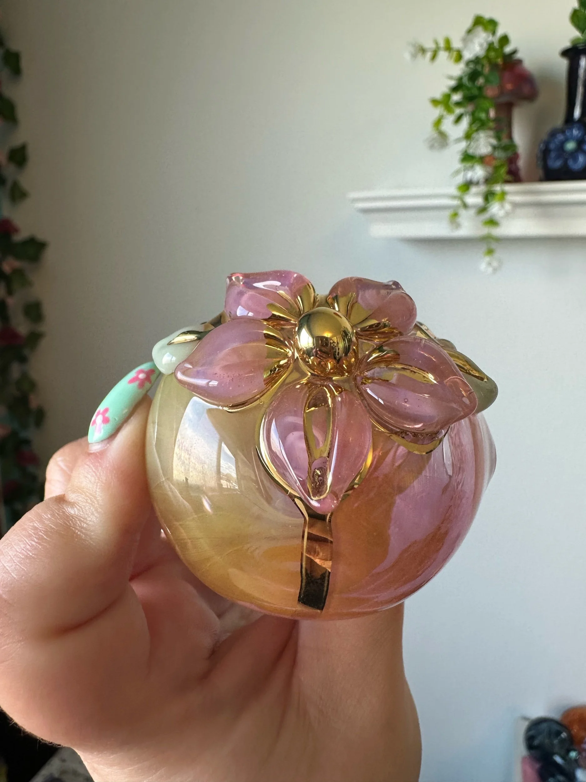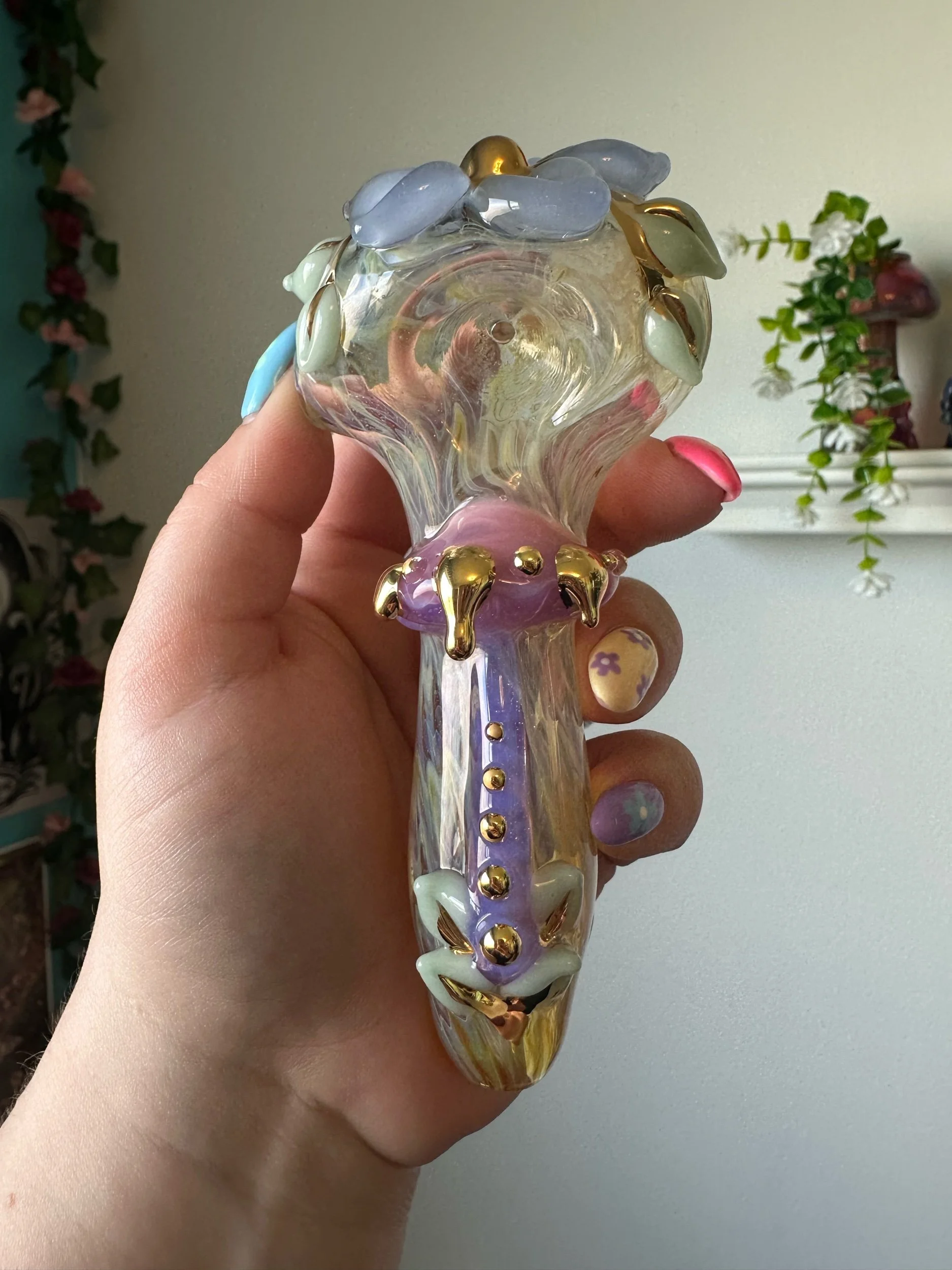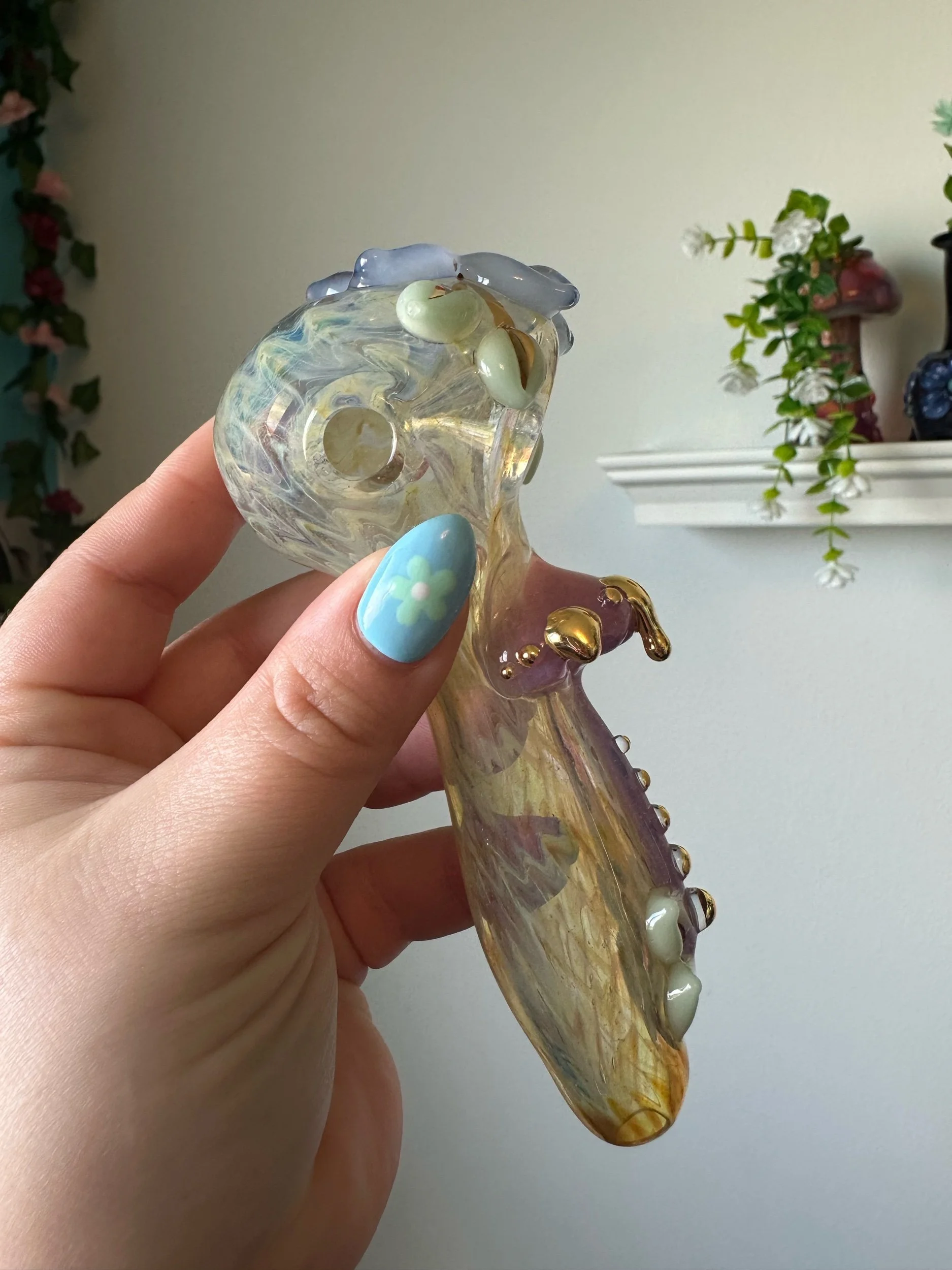 Gold lustre is fired onto the glass leaving a plate of real 22k gold. It is durable enough to wipe clean but can be scratched off with enough force. Soaking in alcohol or other solvents can damage the finish. May wear off with regular use. Do not microwave. Same application and risks apply to Mother Of Pearl Luster. Visit my Helpful Info page for cleaning tips.