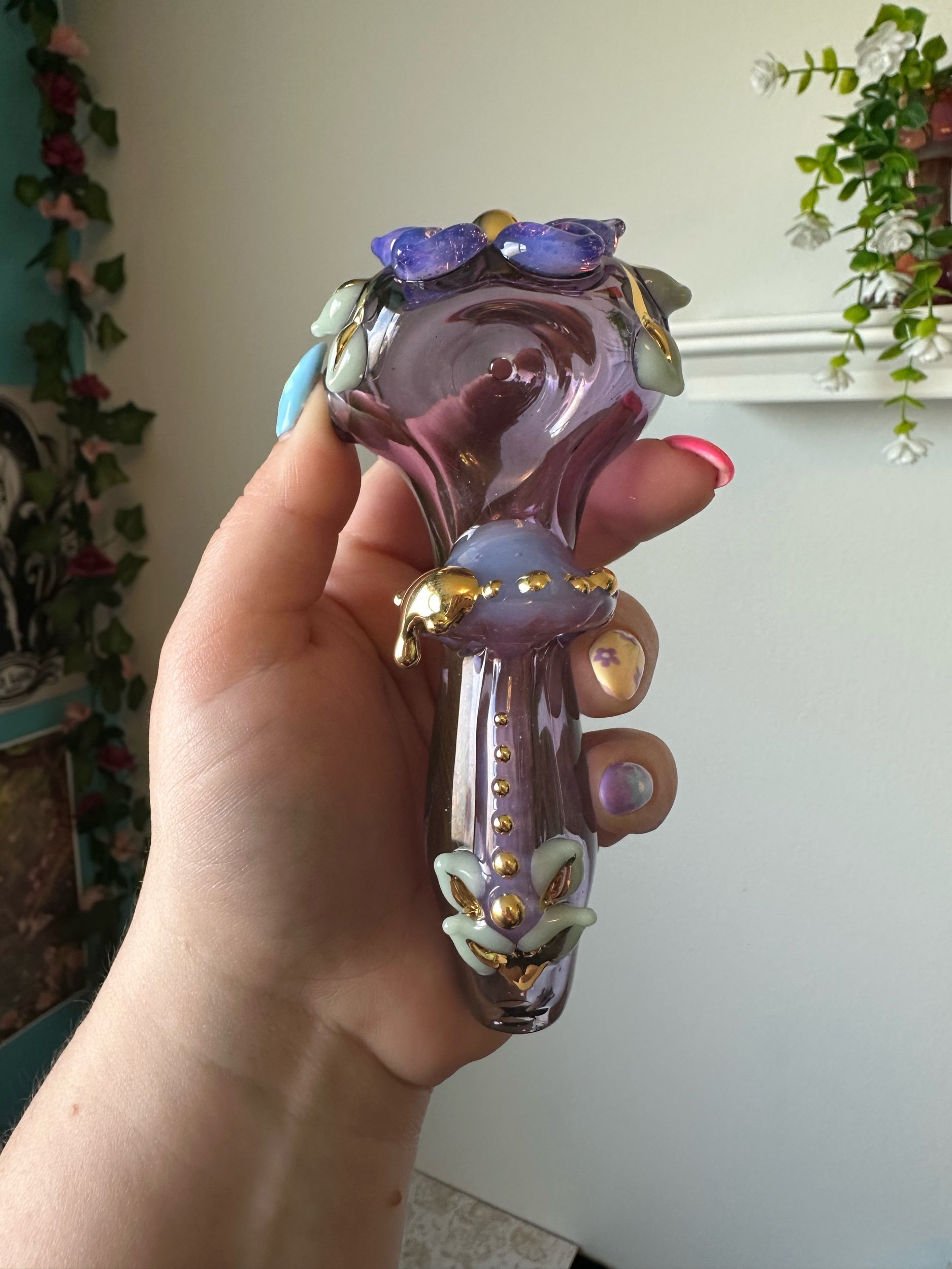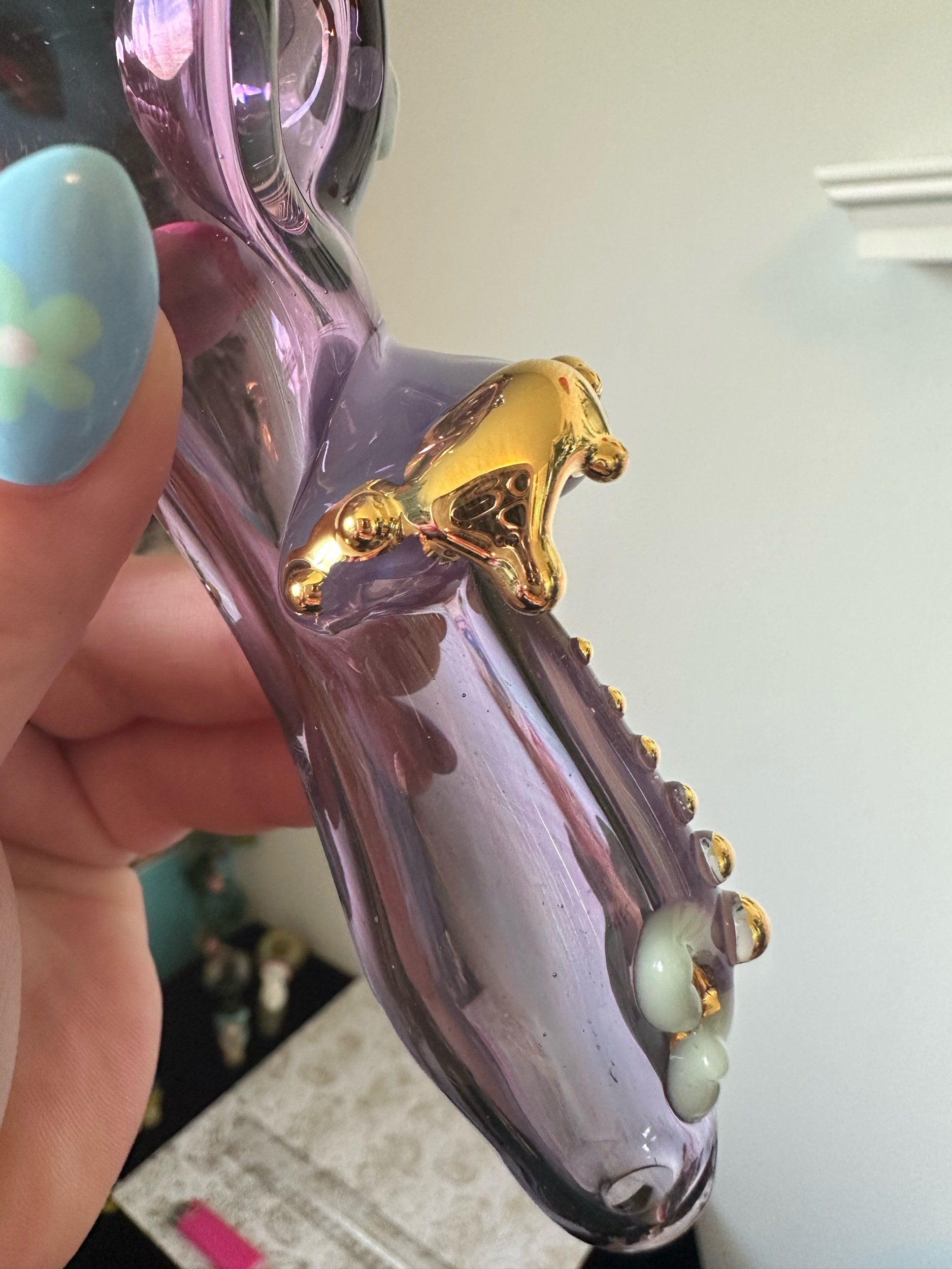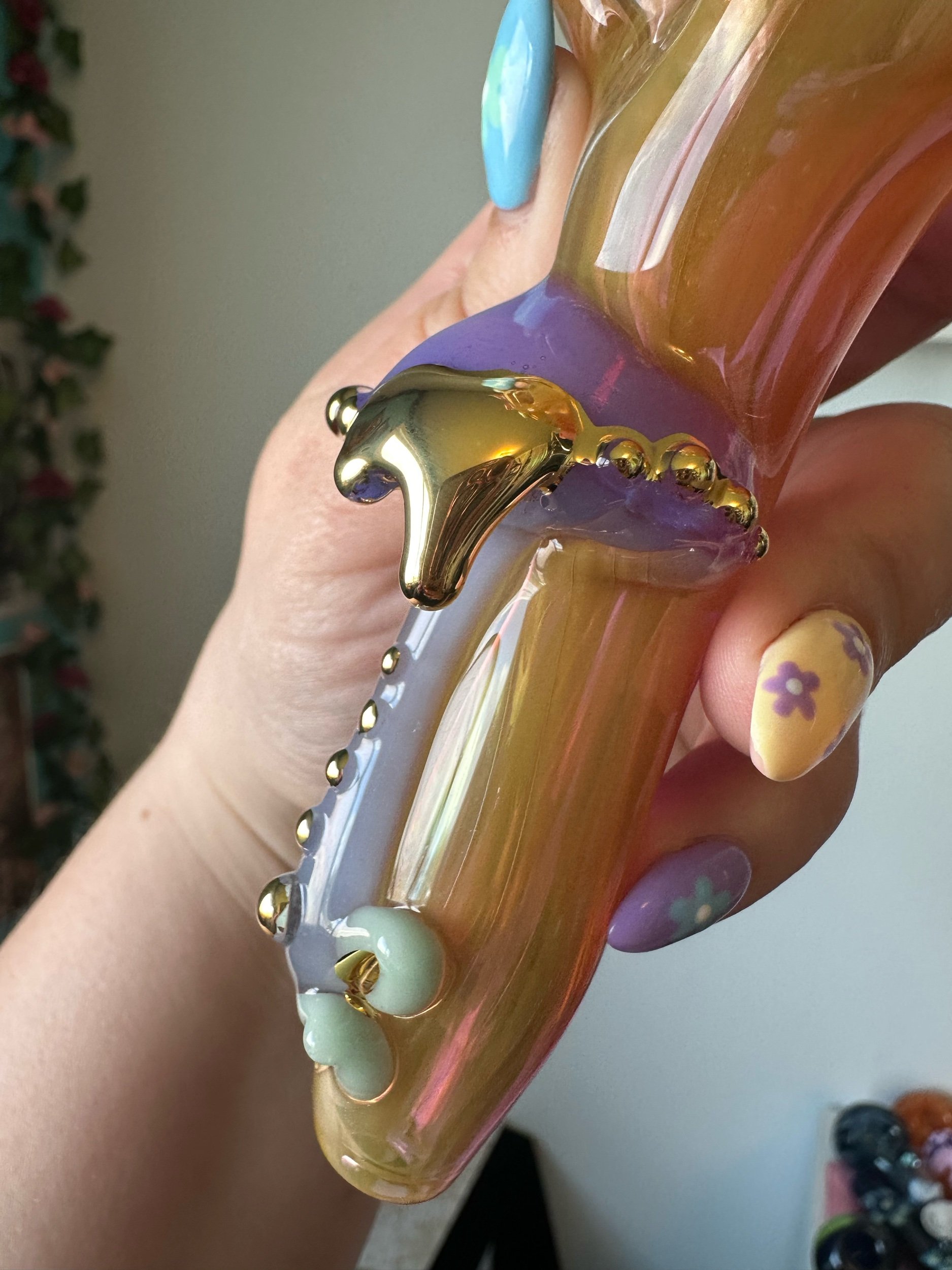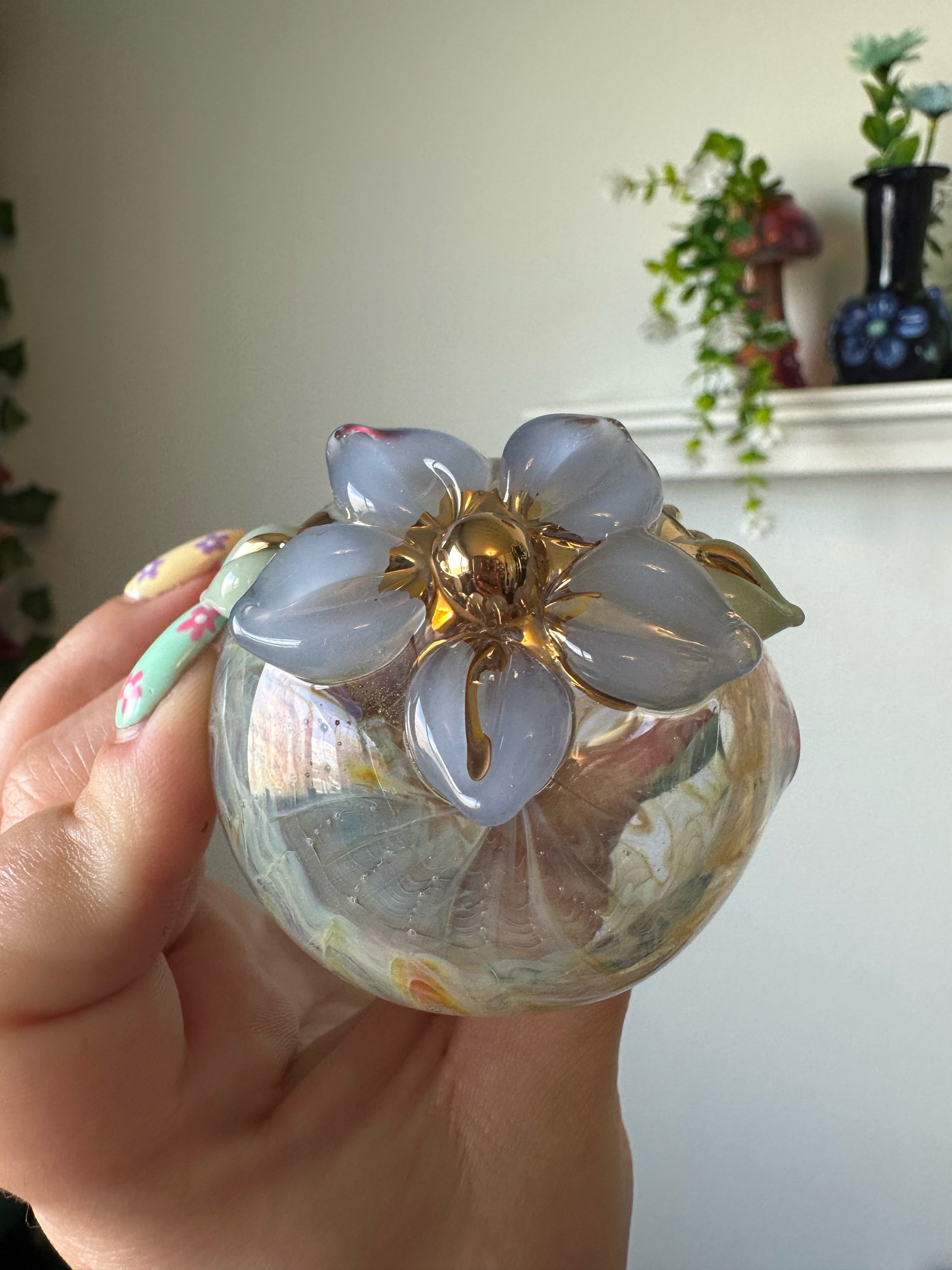 Gold lustre is fired onto the glass leaving a plate of real 22k gold. It is durable enough to wipe clean but can be scratched off with enough force. Soaking in alcohol or other solvents can damage the finish. May wear off with regular use. Do not microwave. Same application and risks apply to Mother Of Pearl Luster. Visit my Helpful Info page for cleaning tips.