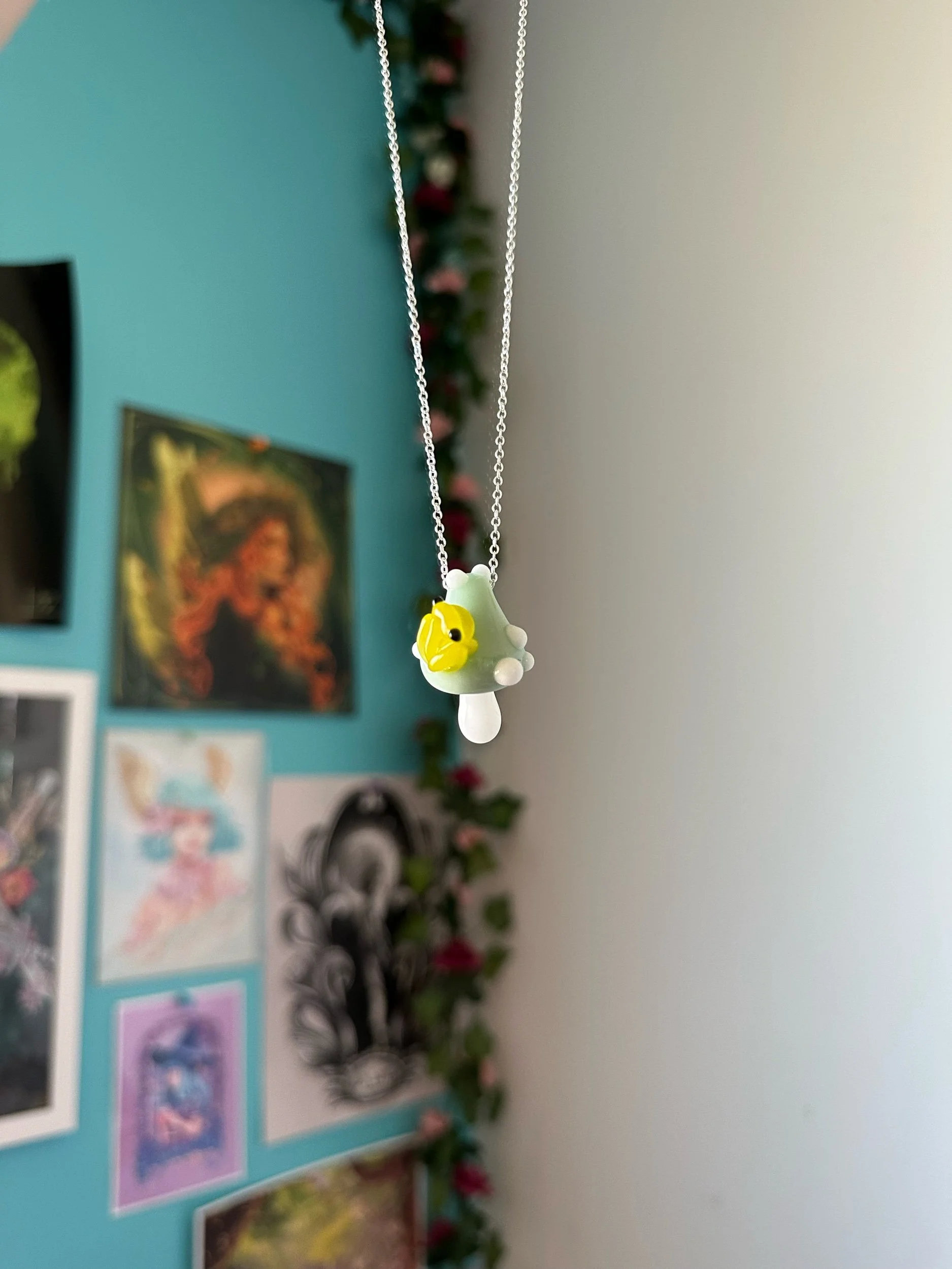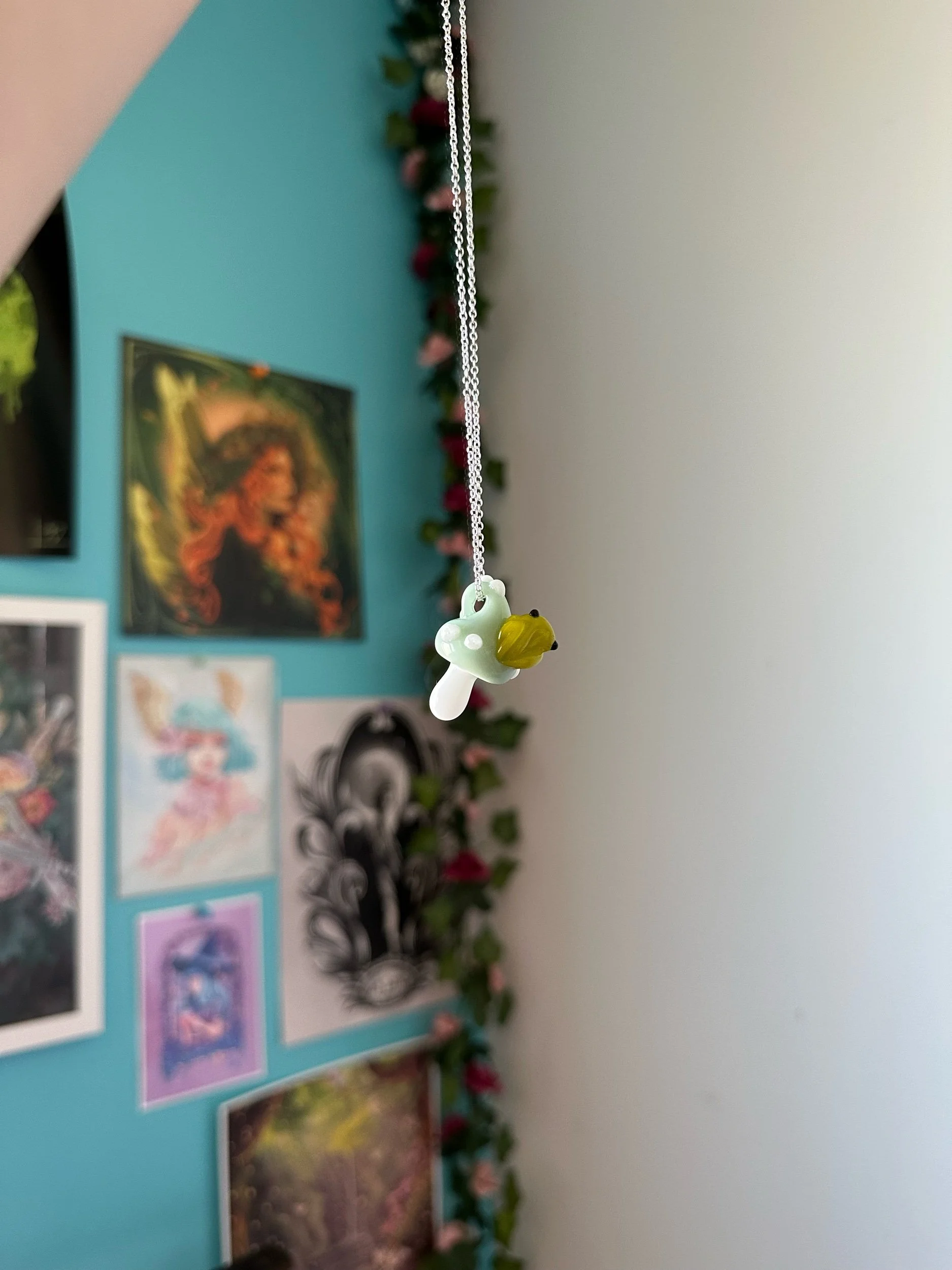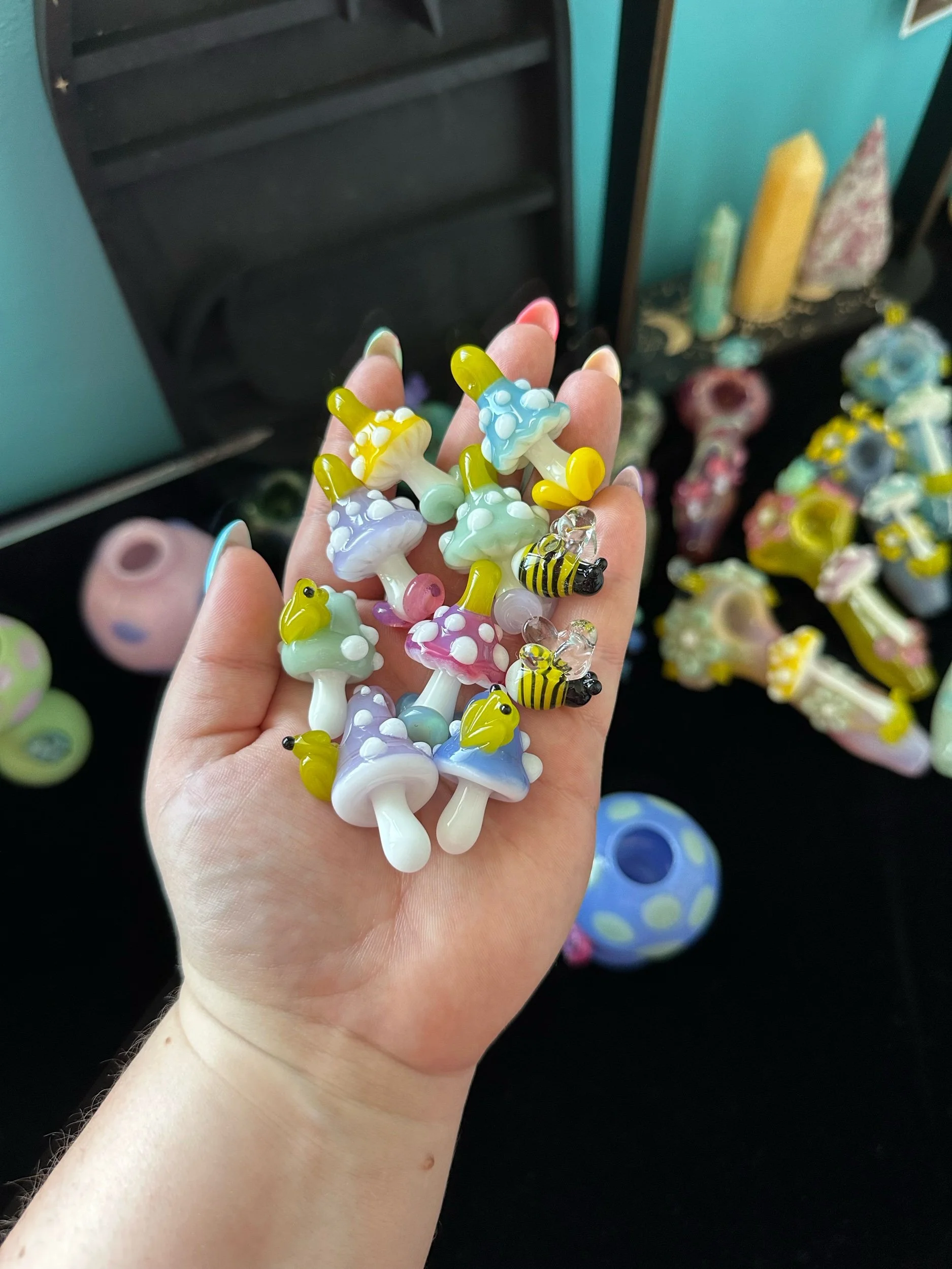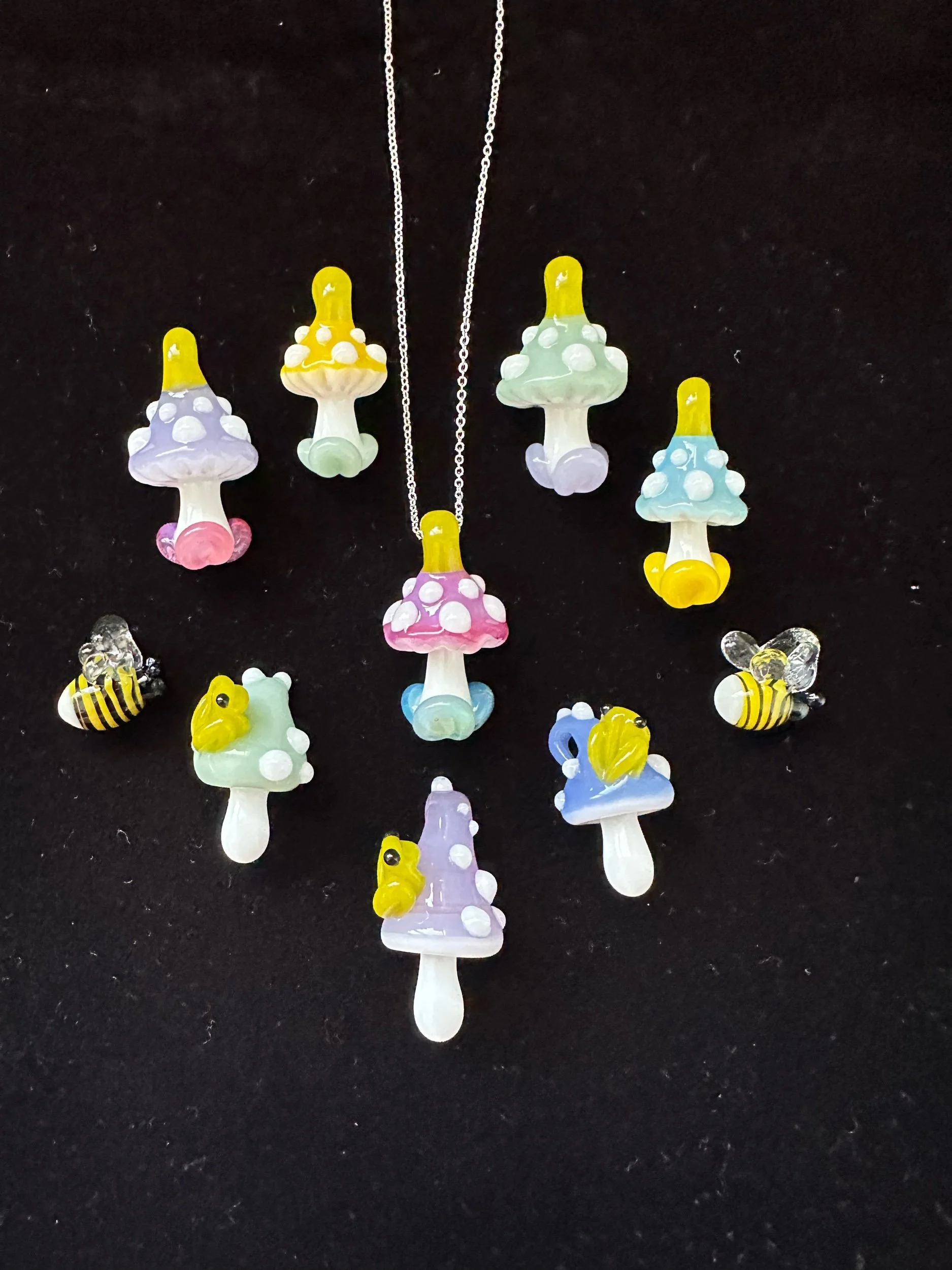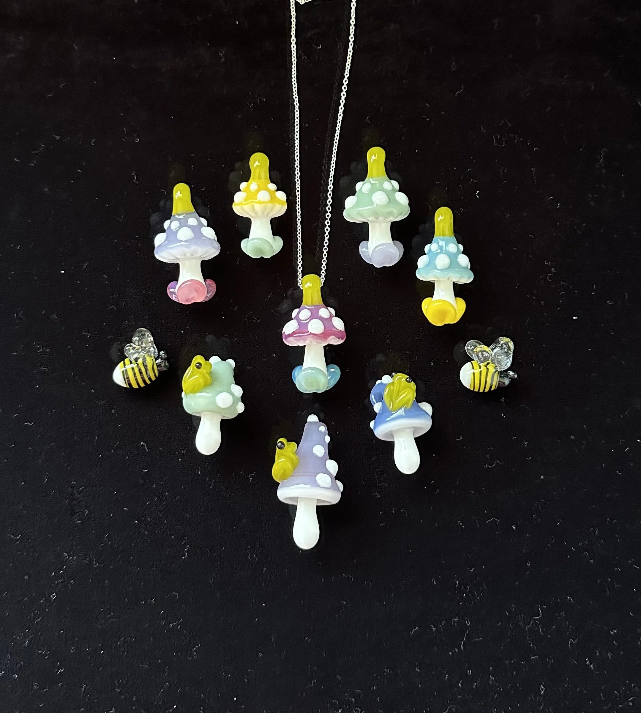 Spring Mushrooms, Bees, Frogs, and Flowers - glass pendant necklaces